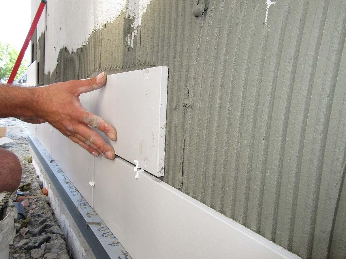 Nicht nur die Fassadenfarbe, auch die Wandfliesen sind genau farblich abgestimmt und folgen somit dem Gesamtkonzept des Architekten. Diese Arbeit benötigt eine ruhige Hand und Präzision; bei unserem Mitarbeiter kann man die Konzentration förmlich spüren.